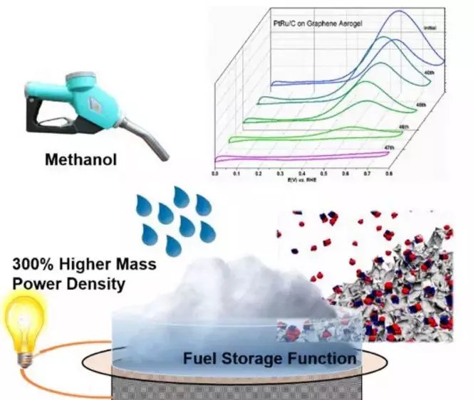 石墨烯气凝胶具有特殊的选择吸附性,即使将12M的甲醇存储在气凝胶中,甲醇也几乎不会穿过质子交换膜。此外,石墨烯气凝胶还起到了燃料存储的作用,使得该燃料电池在无需持续输送甲醇的情况下维持运行,从而省去了外接甲醇存储装置和复杂的燃料循环系统,并降低了制作成本。这项工作对燃料电池的进一步发展起到了重要的推动作用。