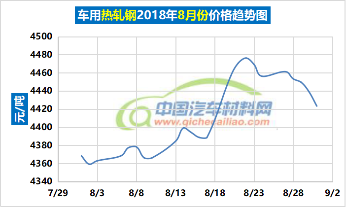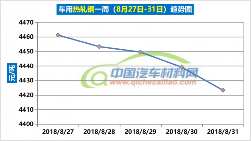 热轧钢本周内价格呈下跌趋势,一周内跌幅达37.92元/吨,本周五价格跌至4423.33元/吨。车用热轧钢本周平均价格为4445.3元/吨,较上周下跌0.46%,较8月份均价上涨0.77%。