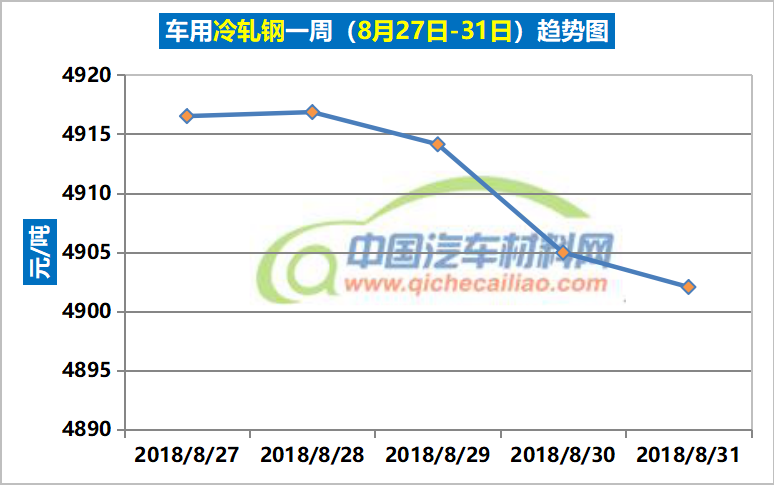 冷轧钢本周价格总体呈下跌趋势,一周内跌幅为14.47元/吨,本周五价格涨至4902.05元/吨。车用冷轧钢本周平均价格为4910.90元/吨,较上周上涨0.14%,较8月份均价上涨1.56%。