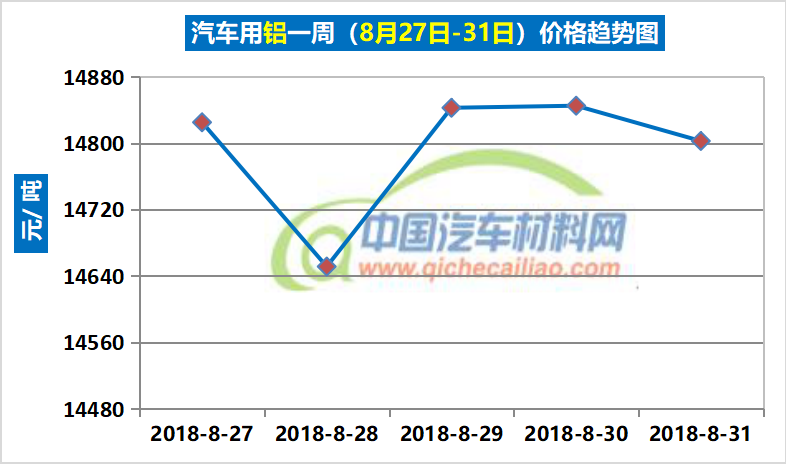 汽车用铝本周内价格变化如下:8月27日-28日,价格下跌,跌幅为174元/吨;8月28-30日价格上涨,涨幅为194元/吨;8月30-31日价格再次小幅下跌。汽车用铝本周均价为14793元/吨,较上周上涨0.81%,较8月份均价上涨1.44%。