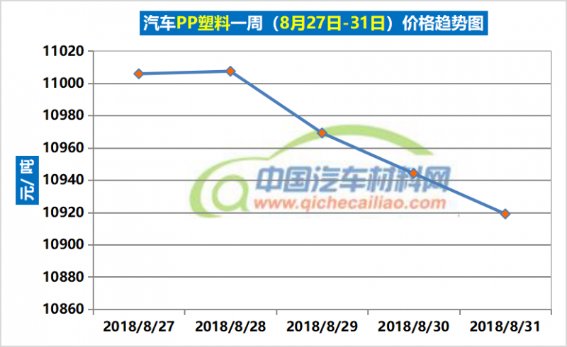 车用PP塑料本周价格呈下跌趋势,一周内跌幅达86.84元/吨,本周五价格跌至10919.04元/吨。车用PP塑料本周均价为10969.13元/吨,较上周上涨2.28%,较8月份均价上涨1.69%。