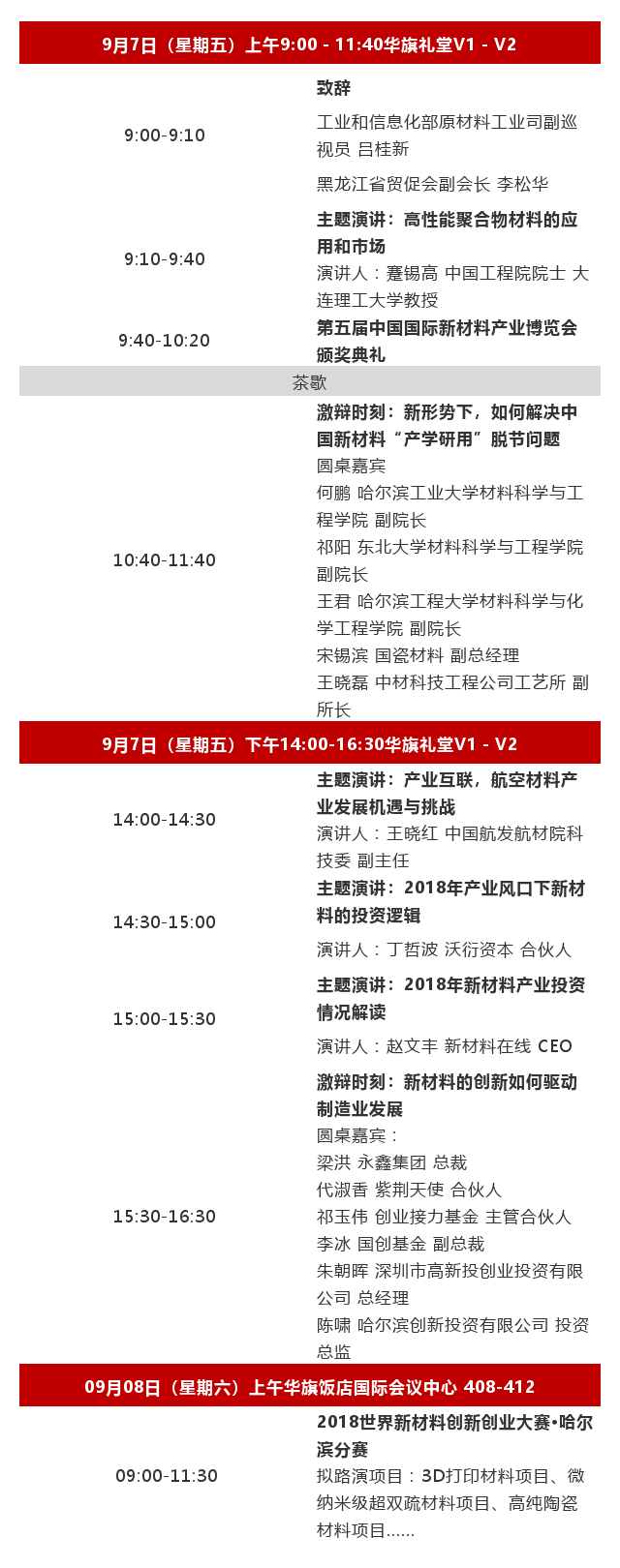 新材料产业资本技术峰会作为第五届新博会同期活动,于2018年9月7日至8日在哈尔滨华旗饭店举行。本次峰会将立足新材料产业发展新态势,紧扣新材料资本和技术这一主题, 与500余位产学研资政各界菁英、领袖大咖深入探讨新材料产业未来发展机遇与挑战,助力新材料产业链上下游企业的转型升级,实现资本与产业的合作共赢!