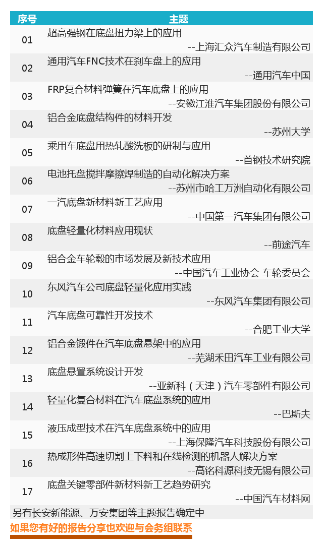 为了全面了解汽车(含新能源)底盘系统新材料新工艺的应用现状,准确把握其发展方向,促进汽车底盘技术研究单位、新材料、零部件和主机厂的产业链技术交流与合作。中国汽车材料网将于2018年10月18-19日在安徽·合肥召开“2018汽车底盘新材料新工艺应用技术研讨会”。将邀请整车厂底盘系统产品设计、底盘关键零部件供应商、底盘相关新材料企业、科研院所和高校等领域的专家,将围绕汽车底盘系统技术趋势、底盘轻量化解决方案、底盘新材料新工艺的发展、新能源汽车模块化底盘创新方案等热点话题展开交流,共同探讨汽车底盘系统的技术发展以及新材料与新工艺的关键应用技术。