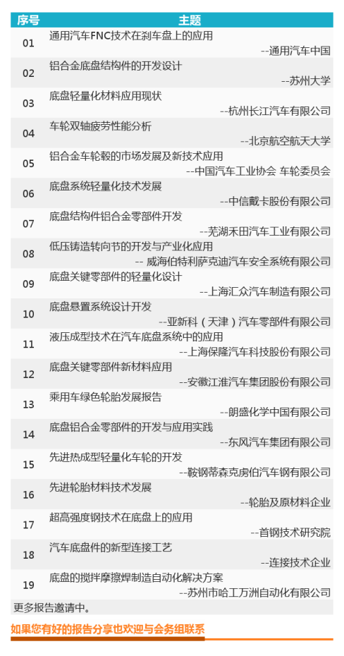 “2018汽车底盘新材料新工艺应用技术研讨会”会议涉及议题丰富,包含国内乘用车市场底盘(悬架、转向系统、EPB等)关键技术趋势分析、国内外典型车型底盘铝合金应用进展及铝化趋势探讨、底盘副车架新材料新工艺、底盘转向节新材料新工艺、底盘控制臂新材料新工艺、汽车底盘件的新型连接工艺等众多内容。