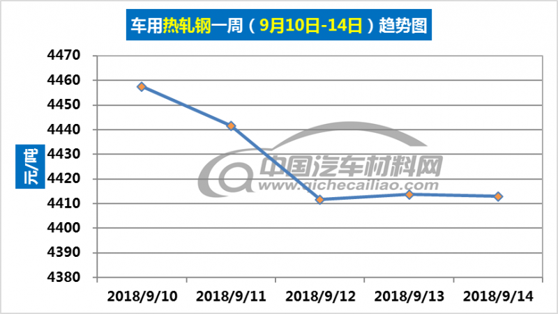 热轧钢本周内价格总体呈下跌趋势,一周内跌幅为44.58元/吨。本周五价格跌至4412.92元/吨。车用热轧钢本周平均价格为4427.5元/吨,较上周上涨0.08%,较8月份均价上涨0.37%。