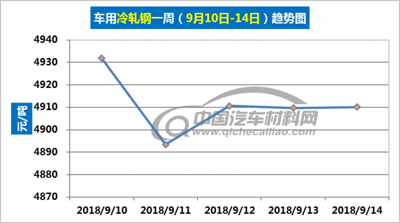 冷轧钢本周价格变化如下:9月10日-11日,价格下跌,跌幅为38.56元/吨;9月11日-14日价格上涨明显,一日内涨幅为16.74元/吨。车用冷轧钢本周平均价格为4911.14元/吨,较上周上涨0.27%,较8月份均价上涨1.57%。