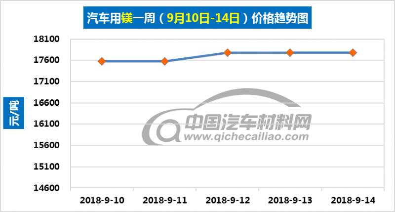 汽车用镁本周价格稳中有升,一周内涨幅为200元/吨;本周五价格涨至17775元/吨。汽车用镁本周均价为17695元/吨,较上周上涨1.26元/吨,较8月份均价上涨0.69%。