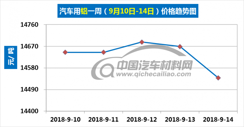 汽车用铝本周内价格变化如下:9月10日-12日,价格上涨,涨幅为43元/吨;9月12日-14日价格下跌,跌幅为149元/吨。汽车用铝本周均价为14637元/吨,较上周下跌1.01%,较8月份均价上涨0.37%。