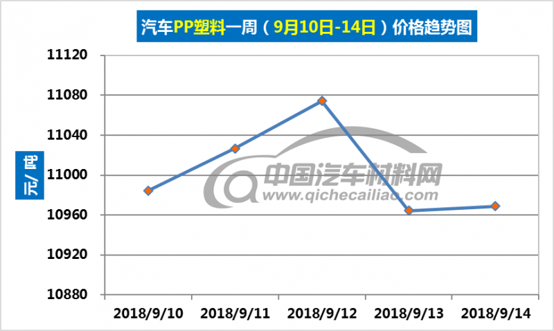 车用PP塑料本周价格变化如下:9月10日-12日,价格上涨,涨幅为89.64元/吨;9月12日-13日,价格又大幅下跌,一日内跌幅达109.83元/吨;9月13日-14日价格再次小幅回升。车用PP塑料本周均价为11003.82元/吨,较上周上涨0.69%,较8月份均价上涨2.01%。