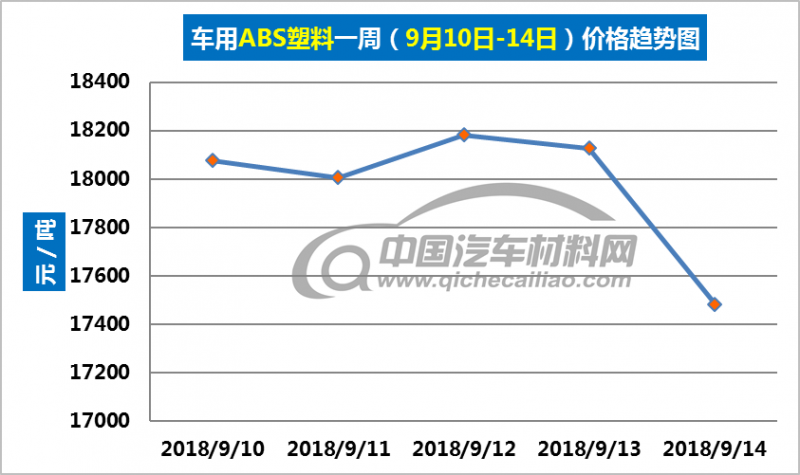 ABS塑料本周价格变化如下:9月10-11日,价格下跌,跌幅为70.11元/吨;9月11日-12日,价格回升;9月12日-14日价格下跌;跌幅为700.64。车用ABS塑料本周均价为17975.78元/吨,较上周上涨0.02%,较8月份均价下跌0.85%。