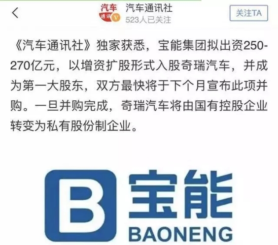 5月中旬,多家媒体爆料称,宝能拟出资收购奇瑞汽车股权,一时间在业内掀起了一轮舆论风波。