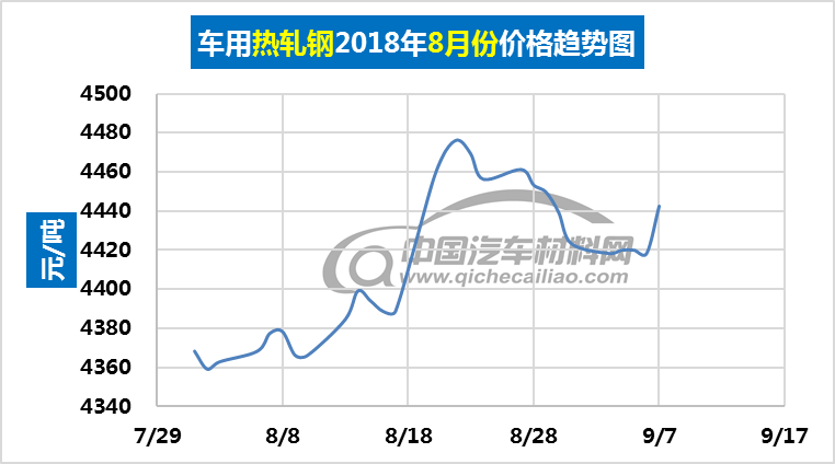 热轧钢本周内价格总体呈下跌趋势,一周内跌幅为18.33元/吨。本周五价格跌至4402.50元/吨。车用热轧钢本周平均价格为4413.3元/吨,较上周下跌0.32%,较8月份均价上涨0.05%。