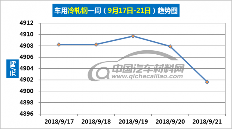 冷轧钢本周价格变化如下:9月17日-19日,价格上涨,涨幅为1.44元/吨;9月18日-21日价格下跌,跌幅为8.07元/吨。车用冷轧钢本周平均价格为4907.15元/吨,较上周下跌0.08%,较8月份均价上涨1.49%。