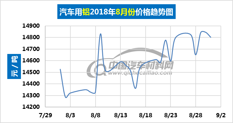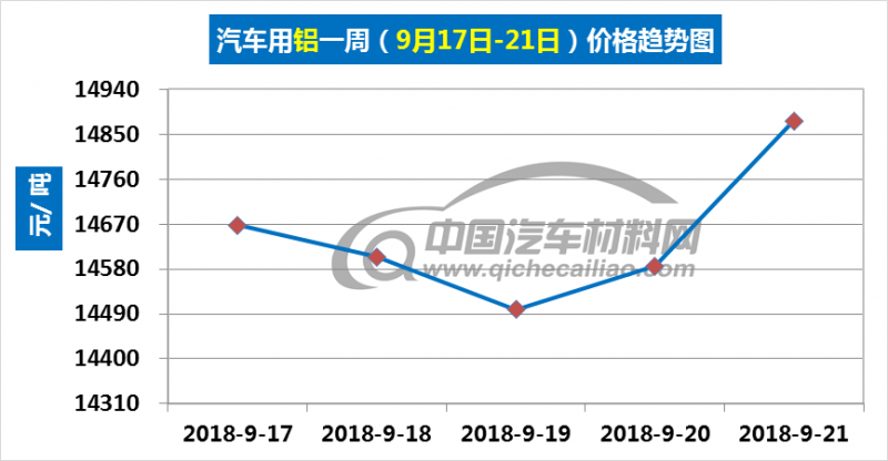 汽车用铝本周内价格变化如下:9月17日-19日,价格下跌,跌为169元/吨;9月19日-21日价格上涨,涨幅为378元/吨。汽车用铝本周均价为14647元/吨,较上周上涨0.07%,较8月份均价上涨0.44%。
