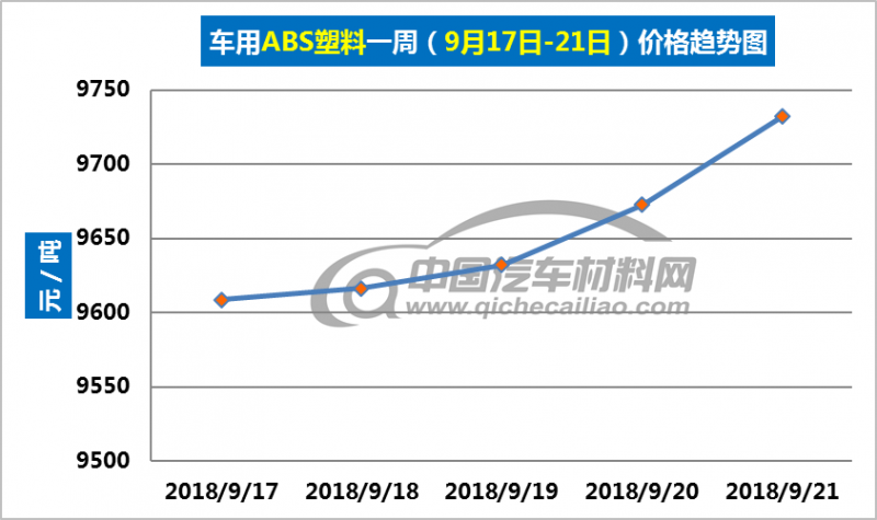 ABS塑料本周价格总体呈上涨趋势,一周内涨幅为123.49元/吨,本周五价格涨至9732.30元/吨。车用ABS塑料本周均价为9652.52元/吨,较上周下跌46.30%,较8月份均价下跌46.76%。