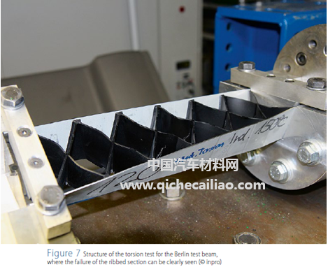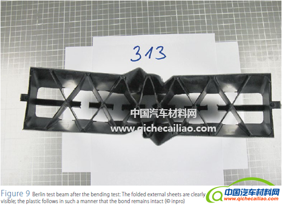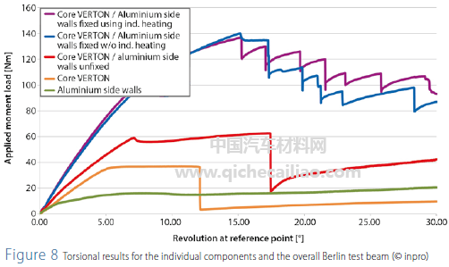 测试结果表明,聚合物芯和外层板板之间的粘合是决定部件整体刚性的关键因素,具体见图7。图8给出了各种部件的扭转试验结果。(测试塑料来自SABIC的LNPVERTON RV00AESP(PA66LGF50),下文缩写为Verton,铝为AlMg3,3.3535,板厚1毫米。)