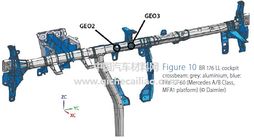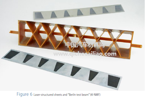 研究人员通过奔驰MFA1平台设计制造了塑料- 金属混合结构(PA-GF60/ Al)仪表板横梁,如图10所示。塑料与金属间的连接在聚酰胺成型过程中实现,采用激光热处理技术实现自动化批量处理。