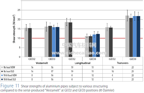 采用Trumpf(通快)激光器实现GEO2和GEO3两个位置的连接。按照DINISO1110标准进行热老化试验:在室温、-30℃和100℃下调节十个温度,每两小时循环一次。对GEO3位置的连接表面还进行了机械疲劳测试:以2.8Hz频率,共进行380,000次循环。为表征机械强度,在相应的GEO2和GEO3位置锯出圆形段,并且在管道方向上以2mm/ min的速度剪切塑料部件。结果如图11所示:式样的最低强度为10N/ mm2,结构方向对式样的强度水平影响较大。在适当范围内,部件承受热应力和机械应力不会导致强度下降。