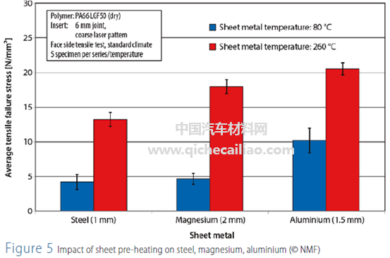 分别在-40℃,室温、80℃(PP)以及90/100℃条件下,对材料的拉伸断裂强度及剪切强度进行测试。图5给出了不同金属嵌件混合材料的力学性能表现,由图可知,相较于钢板和铝合金,镁合金混合材料的力学性能更佳。