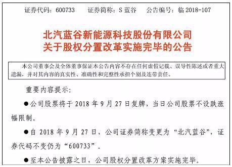 9月25日,S蓝谷发布公告称,北汽蓝谷新能源科技股份有限公司(简称北汽蓝谷)股权分置改革方案已全部实施完毕,股票于2018年9月27日开市起复牌,且复牌当日不设涨跌幅限制。公司证券简称由“S 蓝谷”变更为“北汽蓝谷”,证券代码“600733”保持不变。