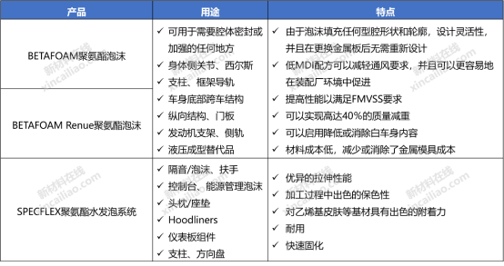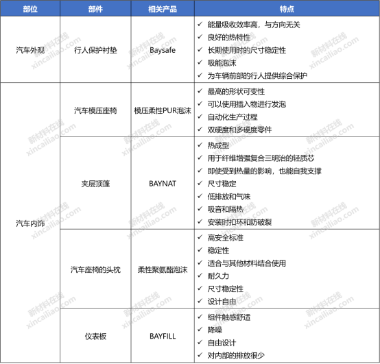 Covestro的聚氨酯在汽车内饰及外饰均有着广泛的应用,产品体系丰富。