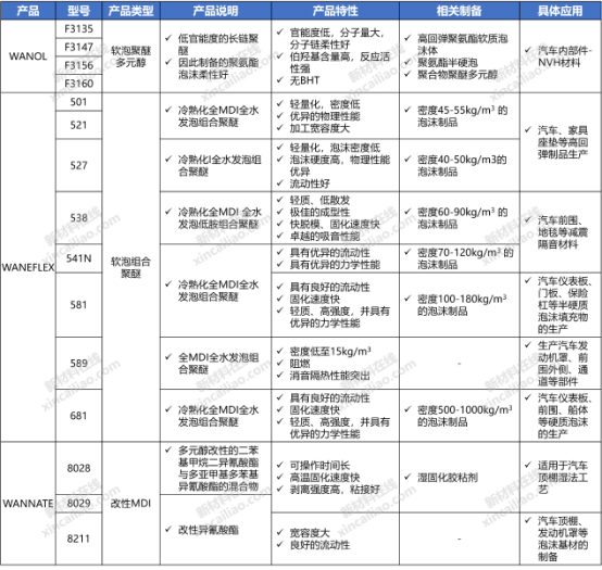 万华化学部分车用产品特性