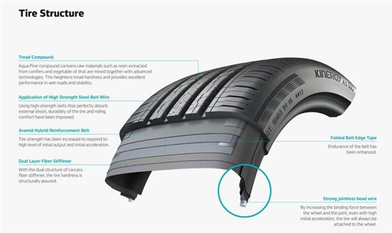 该产品是韩泰第二代AS EV轮胎,并对其结构进行了全新设计,其轮胎的部分材料为芳香族聚(芳纶,aramid),是一款类似尼龙的合成聚合物。该材料常被军用及航空航天企业所采用,可提升Kinergy轮胎的扭矩应力。