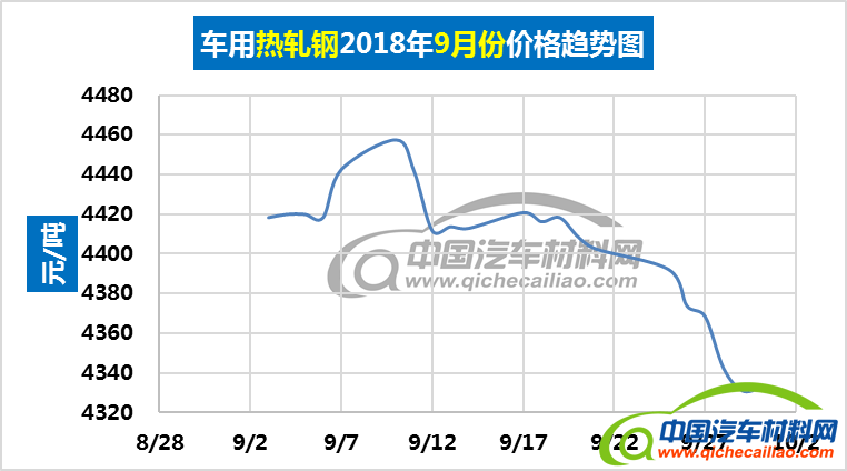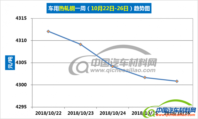 热轧钢本周内价格总体呈下跌趋势,一周内跌幅为11.25元/吨。本周五价格跌至4300.83元/吨。车用热轧钢本周平均价格为4305.6元/吨,较上周下跌0.44%,较9月份均价下跌2.21%。