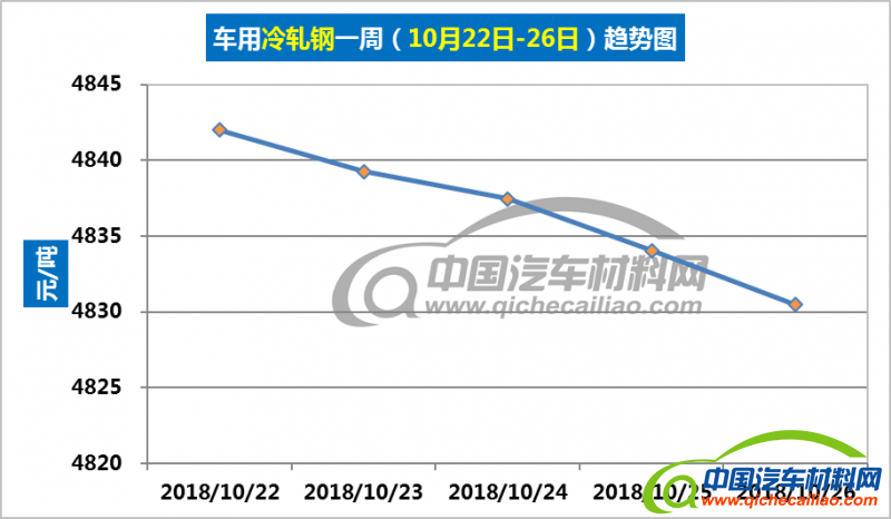 冷轧钢本周价格持续下跌,一周内跌幅为11.52元/吨;本周五价格跌至4830.49元/吨。车用冷轧钢本周平均价格为4836.66元/吨,较上周下跌0.42%,较9月份均价下跌1.24%。