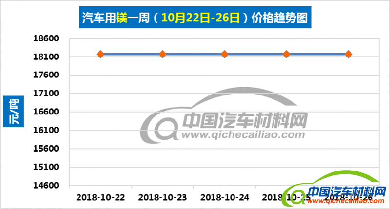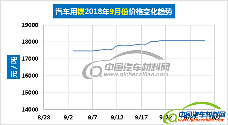 汽车用镁本周价格平稳,维持在18175元/吨,较上周均价上涨1.45%,较9月份均价上涨2.00%。