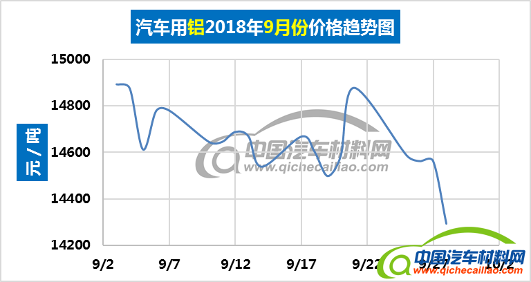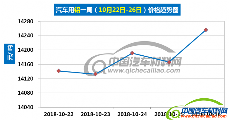 汽车用铝本周内价格主要呈上涨趋势:10月22-23日,价格略有下跌;23-24日,价格上涨,涨幅为59元/吨;24-25日,价格下跌;25-26日价格再次上涨,涨幅为90元/吨。汽车用铝本周均价为14178元/吨,较上周下跌0.68%,较9月份均价下跌3.22%。