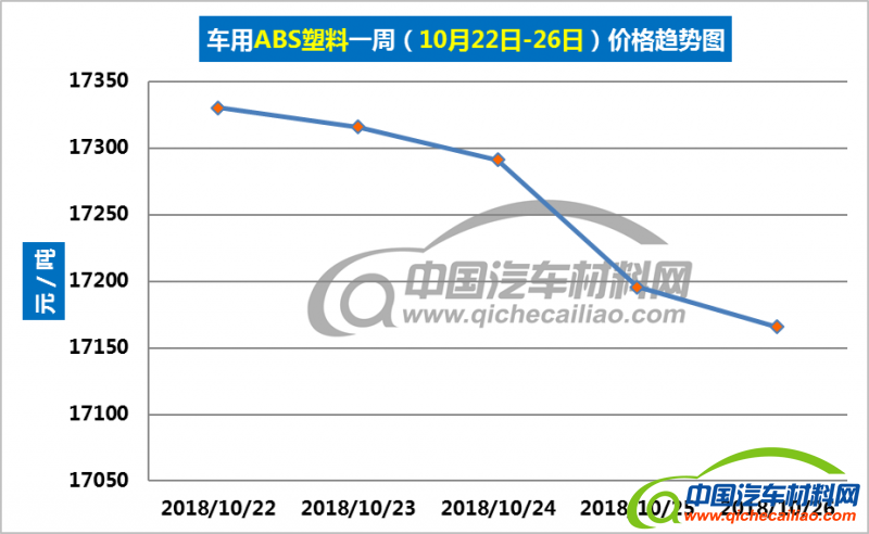 ABS塑料本周价格持续下跌,一周内跌幅为164.22元/吨。车用ABS塑料本周均价为17259.71元/吨,较上周下跌0.51%,较9月份均价上涨7.08%。