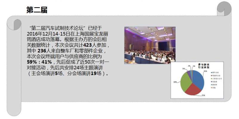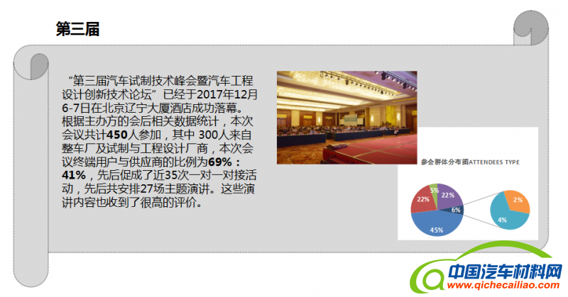 第三届峰会移师北京举办,峰会增加了“汽车工程设计”技术分会场。峰会共计452人参加,近300人来自整车厂及试制与工程设计厂商,终端用户与供应商的比例为69%:41%,先后共安排27场技术主题演讲。