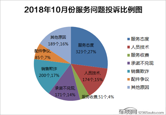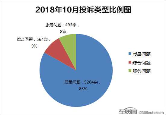 车质网接到的投诉主要分为质量问题、服务问题及综合问题三大类,10月份单纯质量问题的投诉再次突破5000宗,较上月增长4.6%,占比保持不变。服务问题和综合问题的投诉量较9月份出现不同程度的增长,占比同样保持不变。
