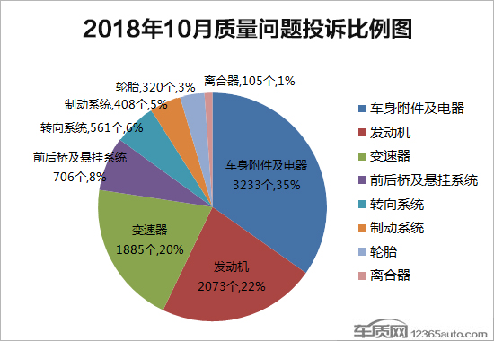 在10月份车质网接到的质量投诉中,车身附件及电器问题的投诉量与9月份基本持平,仍然为投诉量最高的质量问题。受东风日产奇骏和一汽-大众高尔夫“变速箱顿挫”问题高发影响,本月变速器问题的投诉量较9月份上涨20.1%。此外,受东风标致408轮胎召回问题的持续影响,本月轮胎问题的投诉继续保持增长,环比上涨6.7%。