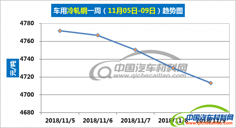 冷轧钢本周价格持续下跌,一周内跌幅为58.60元/吨,本周五价格跌至4713.18元/吨。车用冷轧钢本周平均价格为4746.47元/吨,较上周下跌1.20%,较10月份均价下跌2.06%。