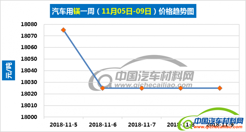 汽车用镁本周价格稳中有小幅跌,11月5日-6日,价格下跌50元/吨;11月6日-9日价格维持稳定。汽车用镁本周均价为18035.0元/吨,较上周下跌0.22%,较10月份均价上涨0.15%。