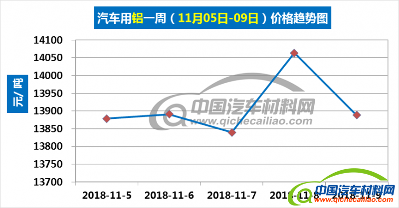 汽车用铝本周内价格变化如下:11月5日-6日,价格小幅上涨,涨幅为13元/吨;11月6-7日,价格下跌;11月7日-8日,价格大幅上涨,涨幅为224元/吨;11月8日-9日,价格再次下跌。汽车用铝本周均价为13913元/吨,较上周下跌0.63%,较10月份均价下跌2.39%。