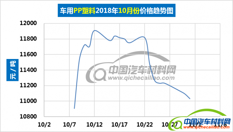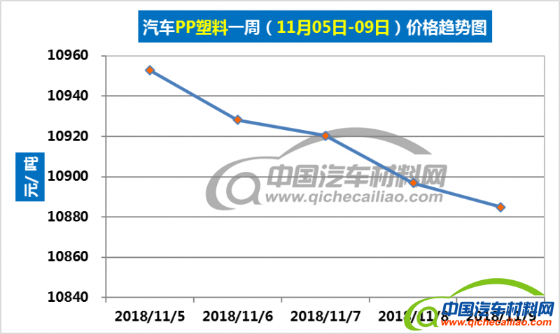 车用PP塑料本周价格呈下跌趋势,一周内跌幅为67.988元/吨,本周五价格跌至10884.90元/吨。车用PP塑料本周均价为10916.65元/吨,较上周下跌1.21%,较10月份均价下跌5.08%。