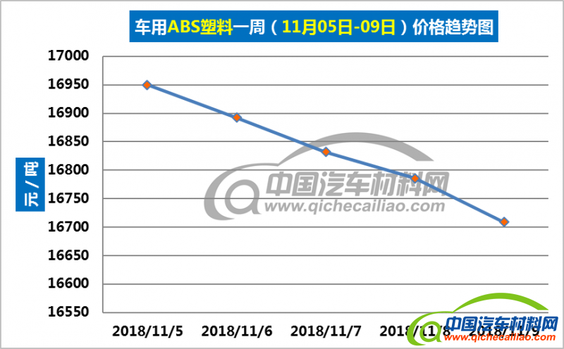 ABS塑料本周价格持续大幅下跌,一周内跌幅为240.65元/吨,本周五价格跌至16709.09元/吨。车用ABS塑料本周均价为16833.69元/吨,较上周下跌1.40%,较10月份均价下跌3.02%。