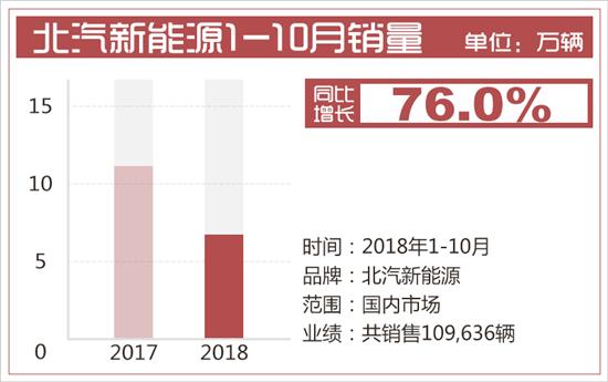 11月13日,有媒体从北汽新能源官方获悉,2018年1-10月份销量达109,636辆,同比大增76%。在“金九银十”整体颓势下实现“逆袭”增长,其中仅10月份销量就有27,958辆,占据整体销量1/4还多。