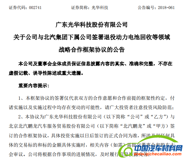11月12日,光华科技(002471.SZ)与北汽集团下属企业北汽鹏龙签署合作框架协议,协议指出,双方将在退役动力电池梯次利用和废旧电池回收处理体系等业务上开展合作。