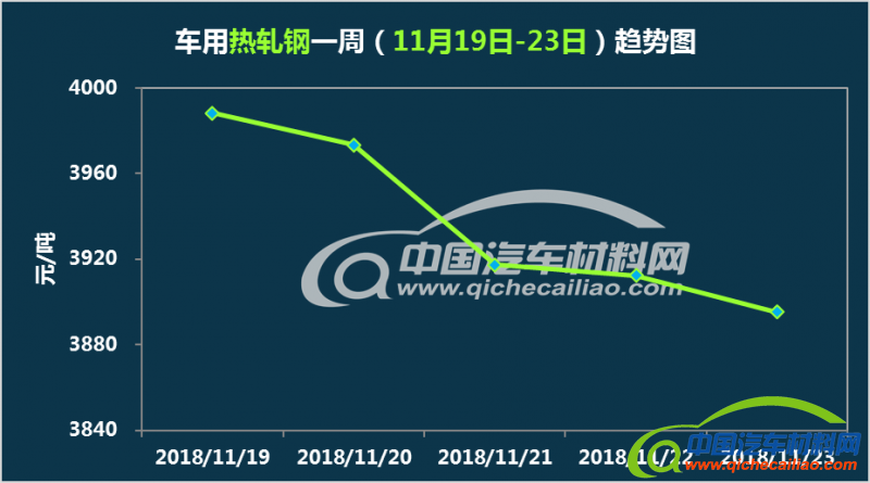汽车用铝本周内价格持续下跌,一周内跌幅为92.92元/吨,本周五价格跌至3895.42元/吨。车用热轧钢本周平均价格为3937.40元/吨,较上周下跌2.36%,较10月份均价下跌8.76%。