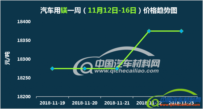 汽车用镁本周价格呈上涨趋势,一周内涨幅为100元/吨,本周五价格涨至18375.0元/吨。汽车用镁本周均价为18315.0元/吨,较上周上涨0.94%,较10月份均价上涨1.70%。