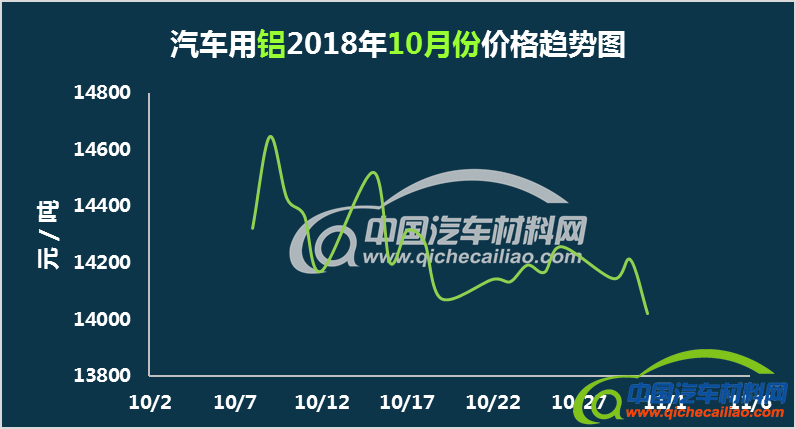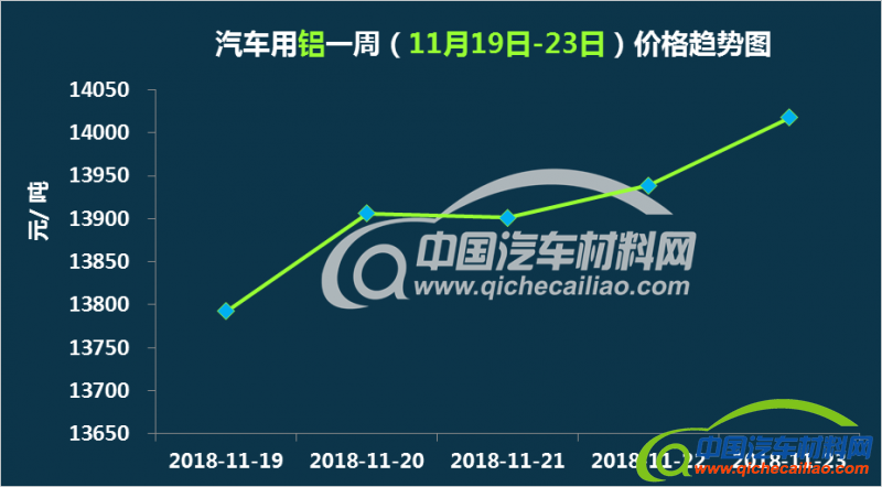汽车用铝本周内价格持续上涨,一周内涨幅为225元/吨,本周五价格涨至14018.0元/吨。汽车用铝本周均价为13911.0吨,较上周上涨1.05%,较10月份均价下跌2.41%。