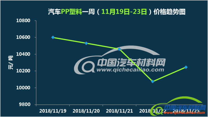车用PP塑料本周价格变化如下:11月19日-22日,价格下跌,跌幅为526.40元/吨;11月22日-23日,价格上涨,涨幅为171.84元/吨。车用PP塑料本周均价为10382.68元/吨,较上周下跌4.90%,较10月份均价下跌9.73%。