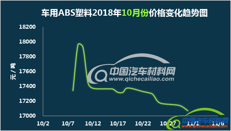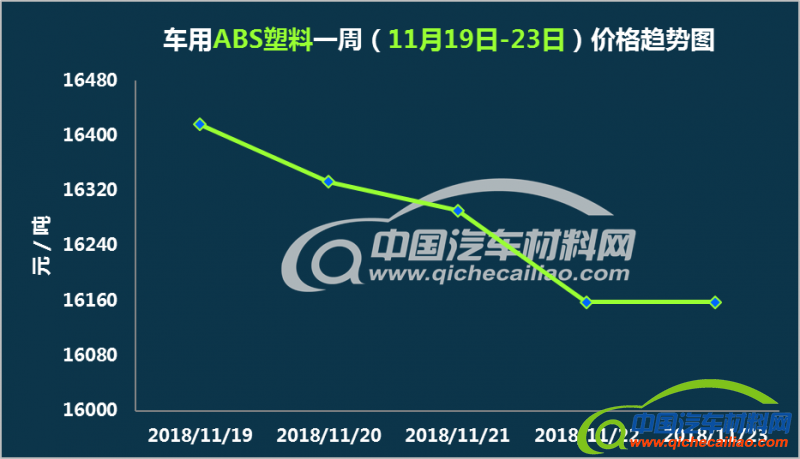 ABS塑料本周价格持续下跌,一周内跌幅为257.86元/吨,本周五价格跌至16158.05元/吨。车用ABS塑料本周均价为16271.14元/吨,较上周下跌3.34%,较10月份均价下跌6.26%。
