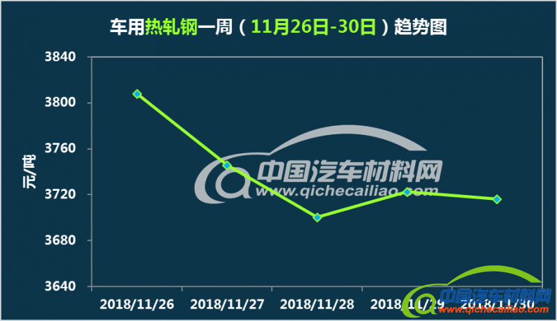 汽车用铝本周内价格变化如下:11月26日-28日,价格下跌,跌幅为107.5元/吨;11月28-29日,价格有所回升,但29-30日又出现小幅下跌。车用热轧钢本周平均价格为3738.6元/吨,较上周下跌5.05%,较11月份均价下跌6.44%。