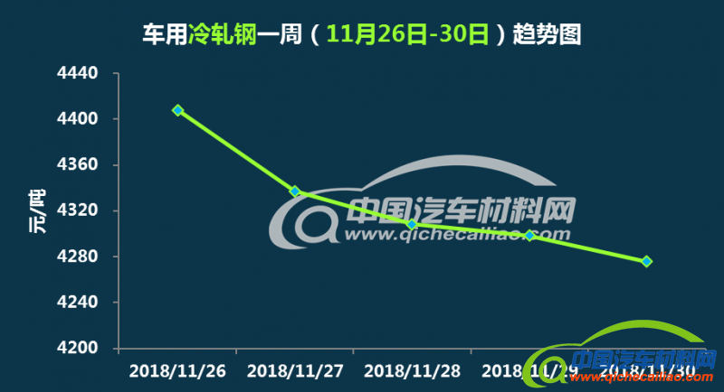 冷轧钢本周价格持续下跌,一周内跌幅为132.16元/吨,本周五价格跌至4275.87元/吨。车用冷轧钢本周平均价格为4325.58元/吨,较上周下跌4.41%,较11月份均价下跌5.49%。