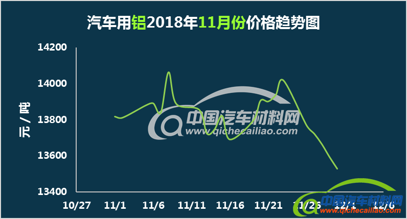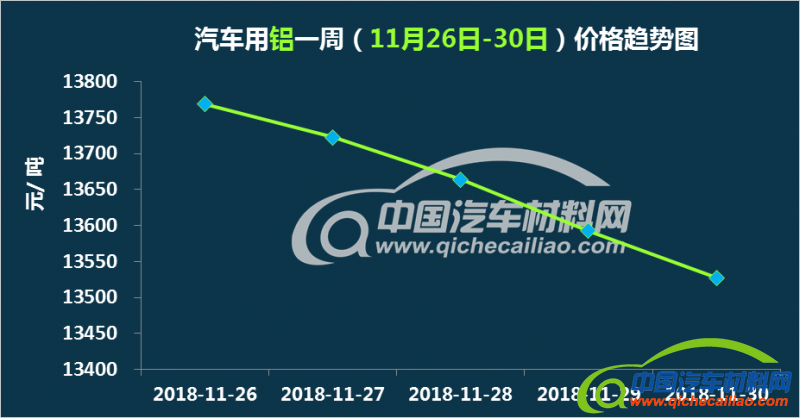 汽车用铝本周内价格持续下跌,一周内跌幅为241元/吨,本周五价格涨至13528元/吨。汽车用铝本周均价为13655元/吨,较上周下跌1.84%,较11月份均价下跌1.13%。